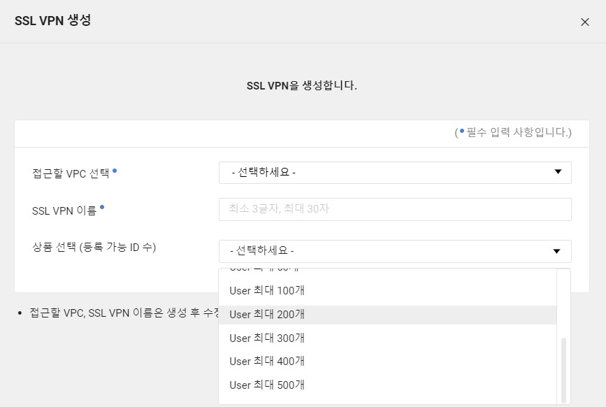 SSL VPN 생성을 클릭하면 SSL VPN을 연결할 VPC와 등록가능한 ID 수를 선택할 수 있습니다.