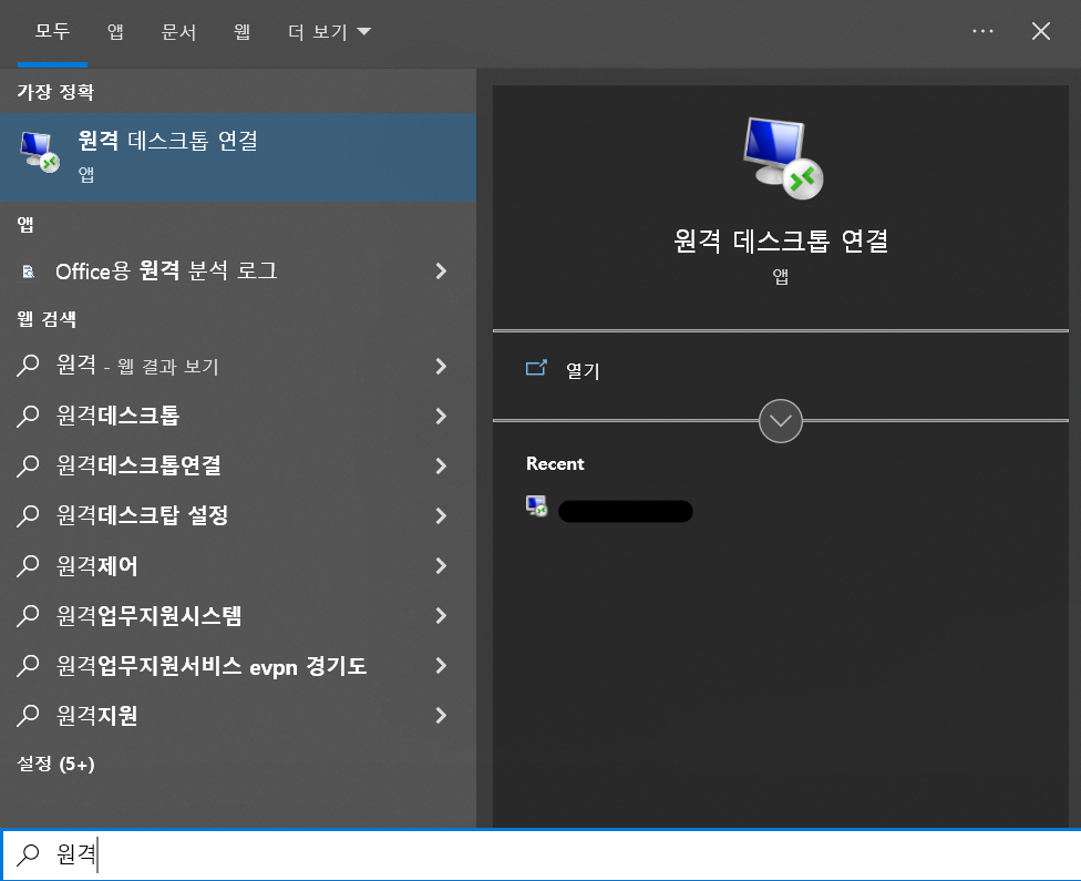 왼쪽 하단 검색을 이용하여 '원격'까지만 검색해도