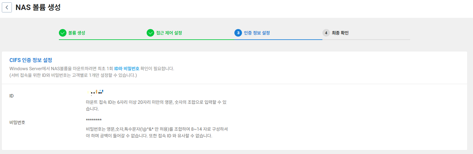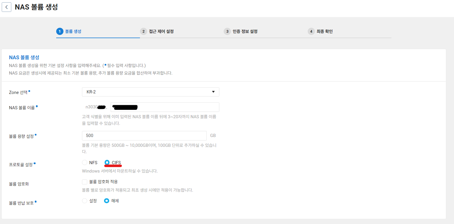 프로토콜을 CIFS 로 선택해서 NAS를 생성할 때에는