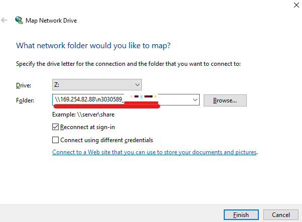 Connect using different credentials를 선택한 후 Finish 버튼을 눌러줍니다.