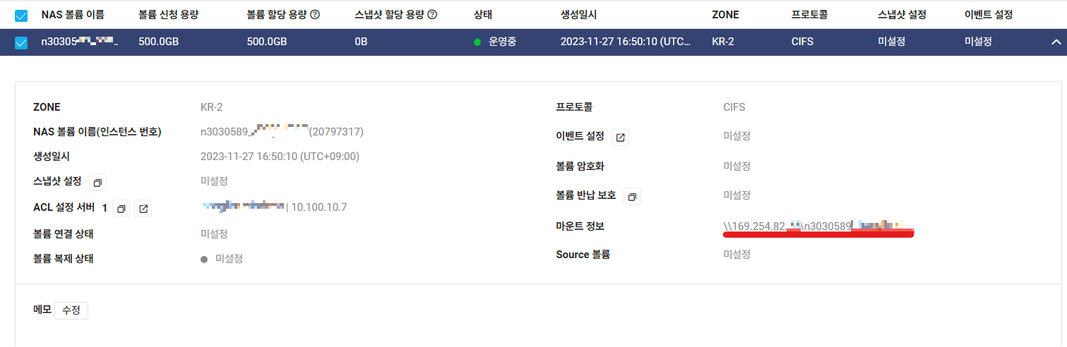 이후 NCP에 표시되는 마운트 정보를 입력해줍니다.