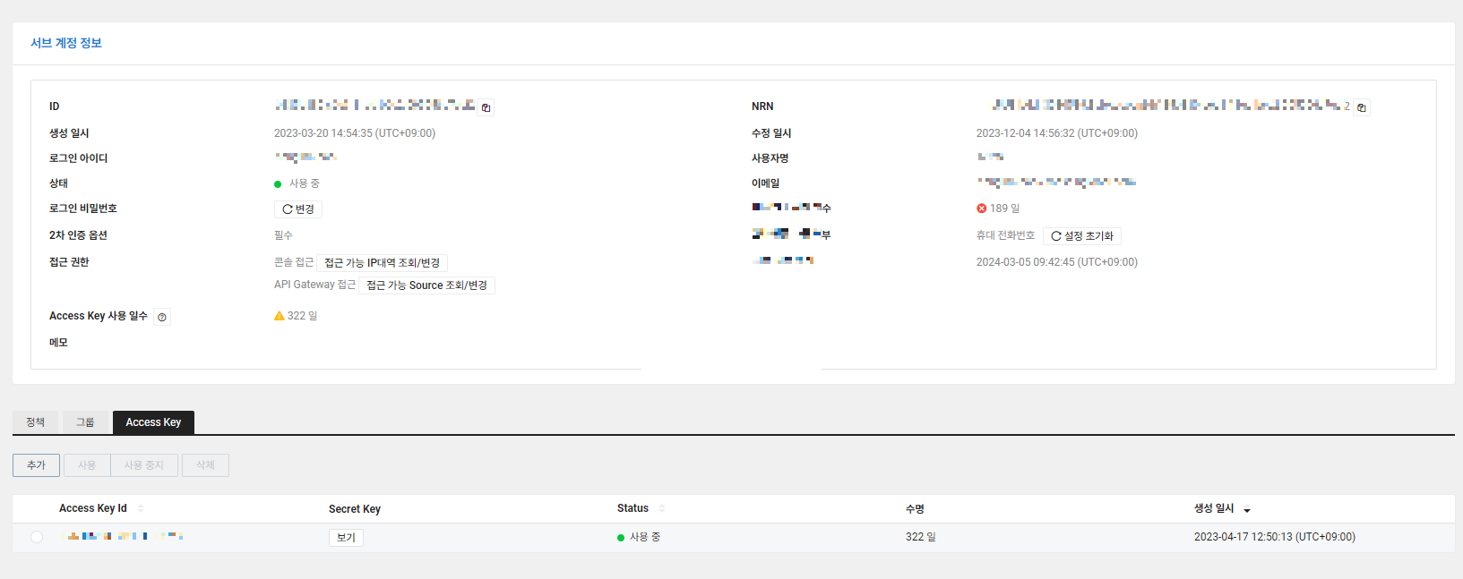 아래 쪽에 수정 버튼을 클릭하여 저장해주고 나오면 Access Key 탭이 활성화 되어있는 것을 확인할 수 있다.