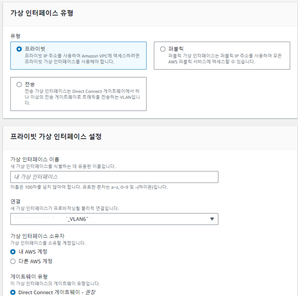 - 콘솔 → Direct Connect → 연결 → 생성된 연결 선택 → 가상 인터페이스 → 가상 인터페이스 생성