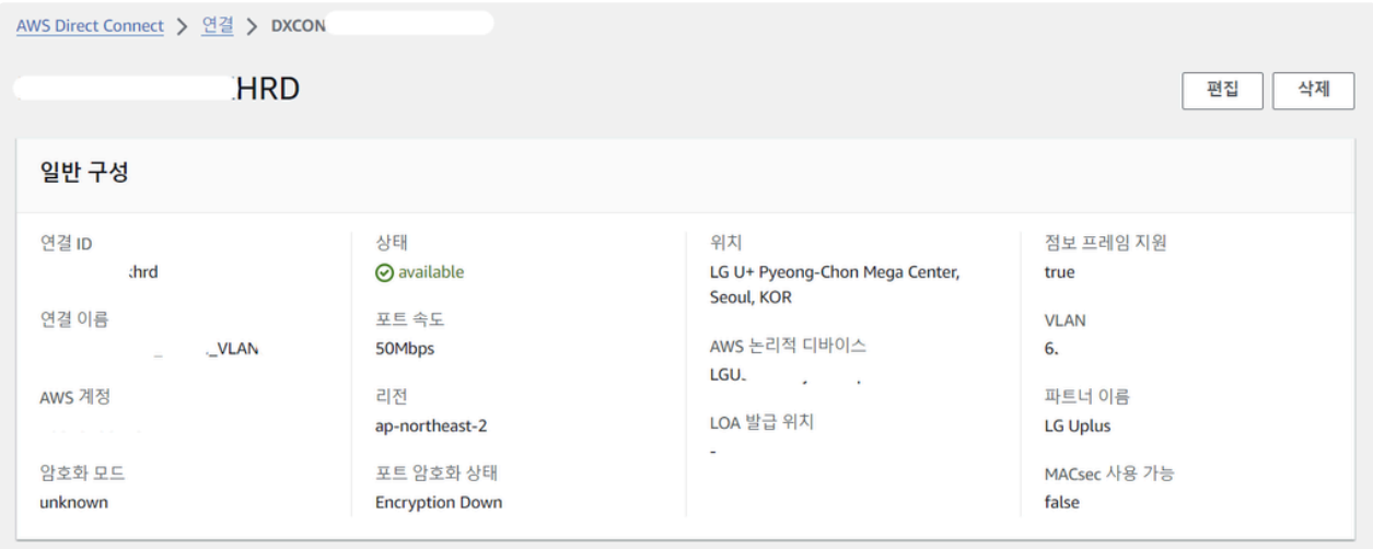- AWS 콘솔 → AWS Direct Connect → 연결 → 생성한 연결 선택 후 위쪽에 수락 클릭