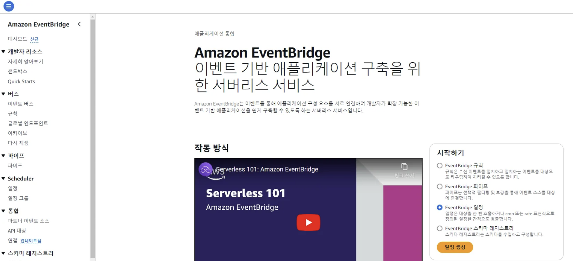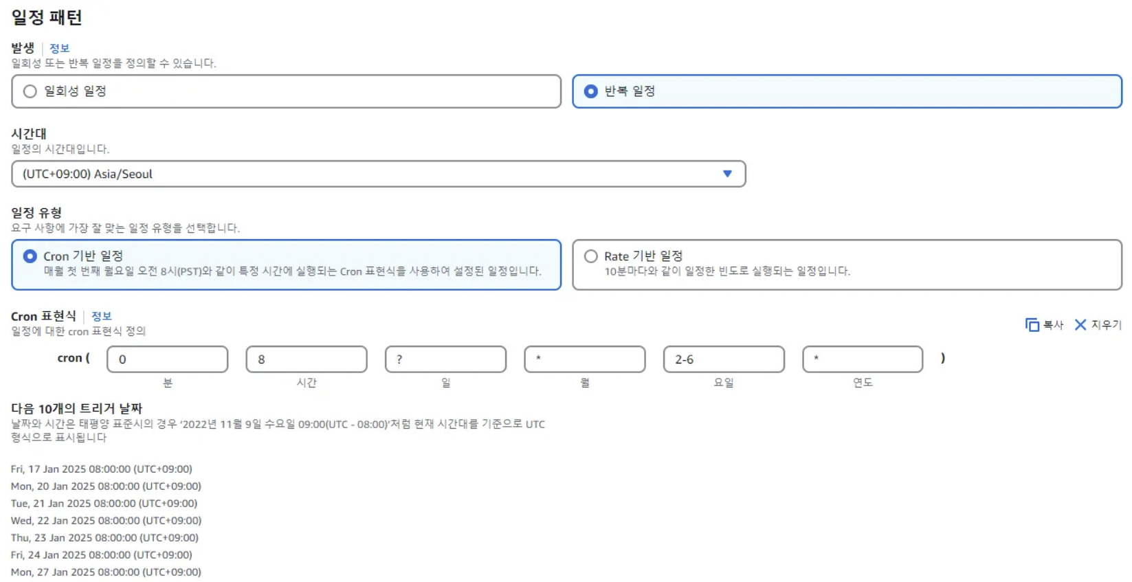 - AWS 콘솔 → Amazon EventBridge → EventBridge 일정 → 일정 생성