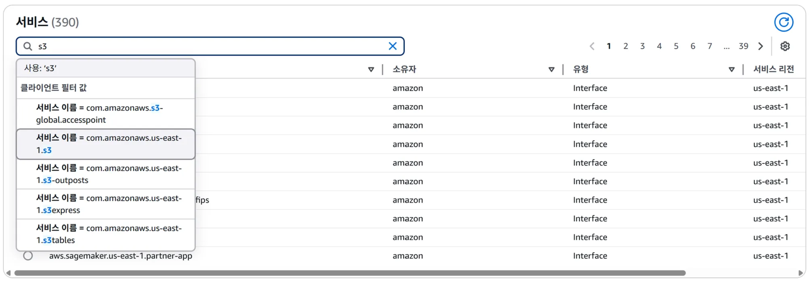 - 서비스에 s3 검색 후 com.amazonaws.us-east-1.s3 선택