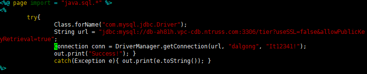 vim index.jsp<%@ page import = "java.sql.*" %> <% try{ Class.forName("com.mysql.jdbc.Driver"); String url = "jdbc:mysql://db-ah81h.vpc-cdb.ntruss.com:3306/tieruseSSL=false&allowPublicKeyRetrieval=true"; Connection conn = DriverManager.getConnection(url, "dalgong", "It12341!"); out.print("Success!"); } catch(Exception e){ out.print(e.toString()); } %>